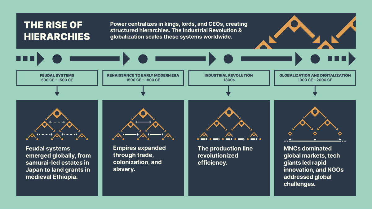 The Industrial Revolution further solidified centralized power structures. Innovations like the production line and railroads enabled unprecedented efficiency, creating the foundation for the multinational corporations of the 20th century. The globalization and digitalization era saw these corporations dominate, while NGOs and tech giants addressed global challenges. Despite the interconnectedness, power largely remained centralized, echoing the hierarchies of the past.